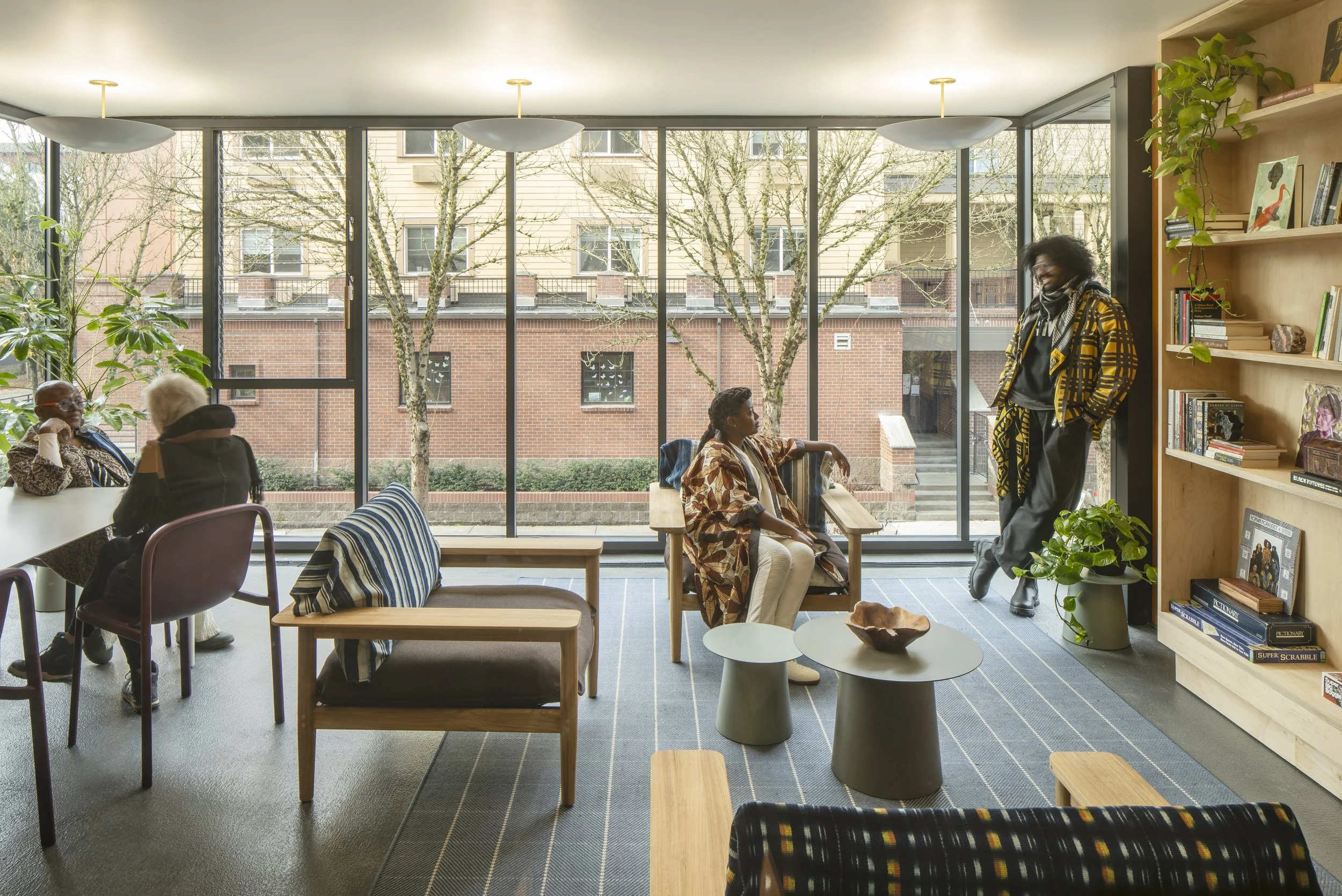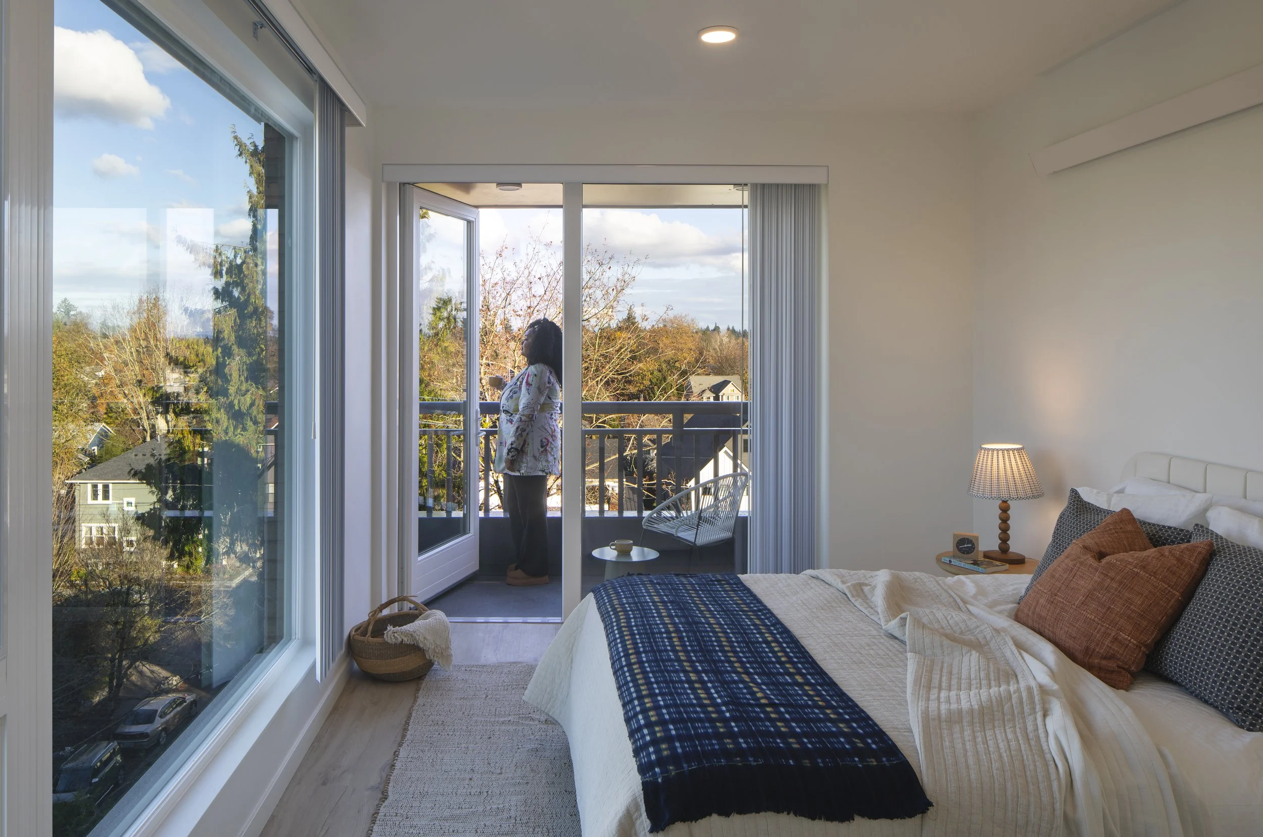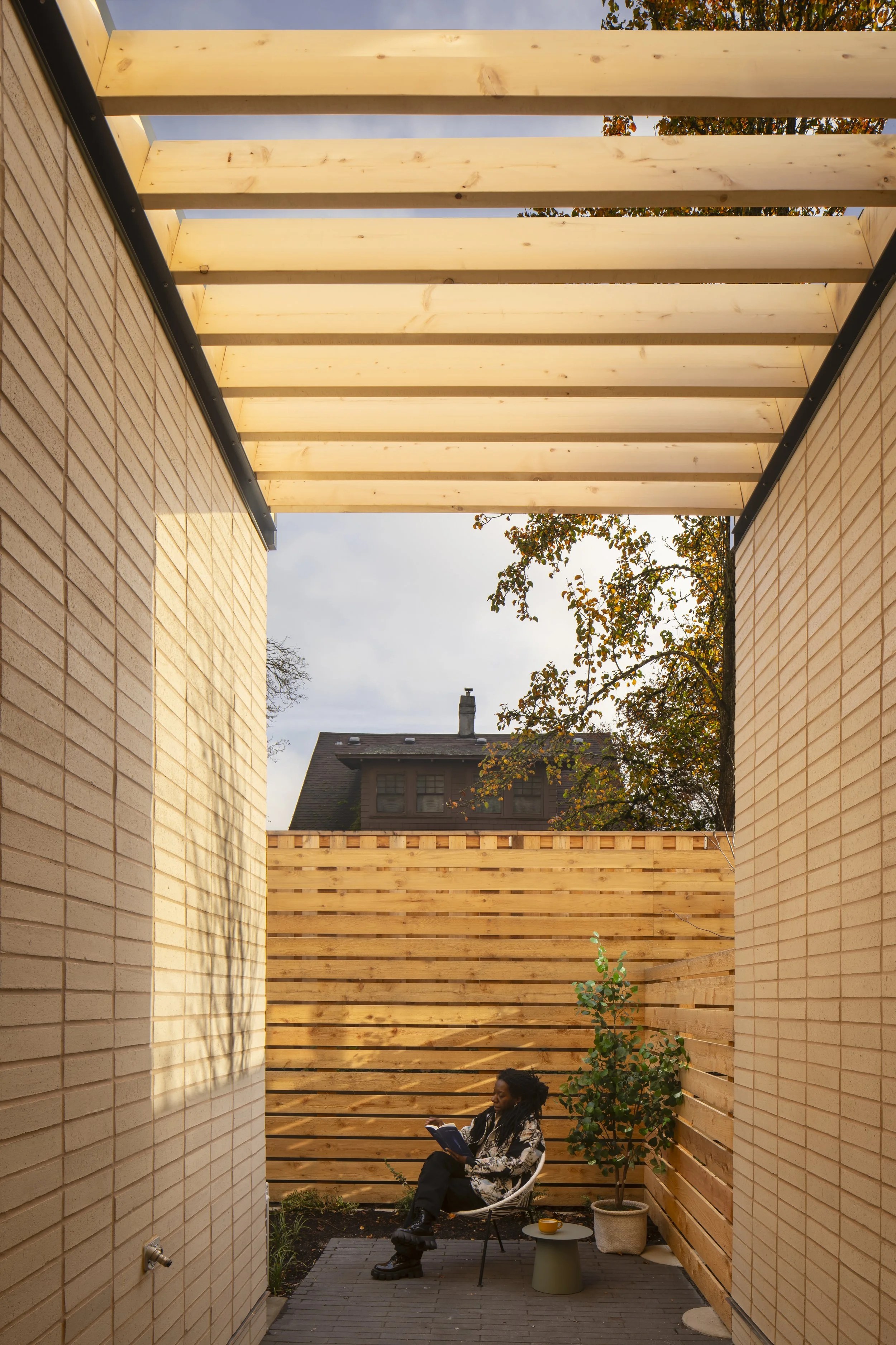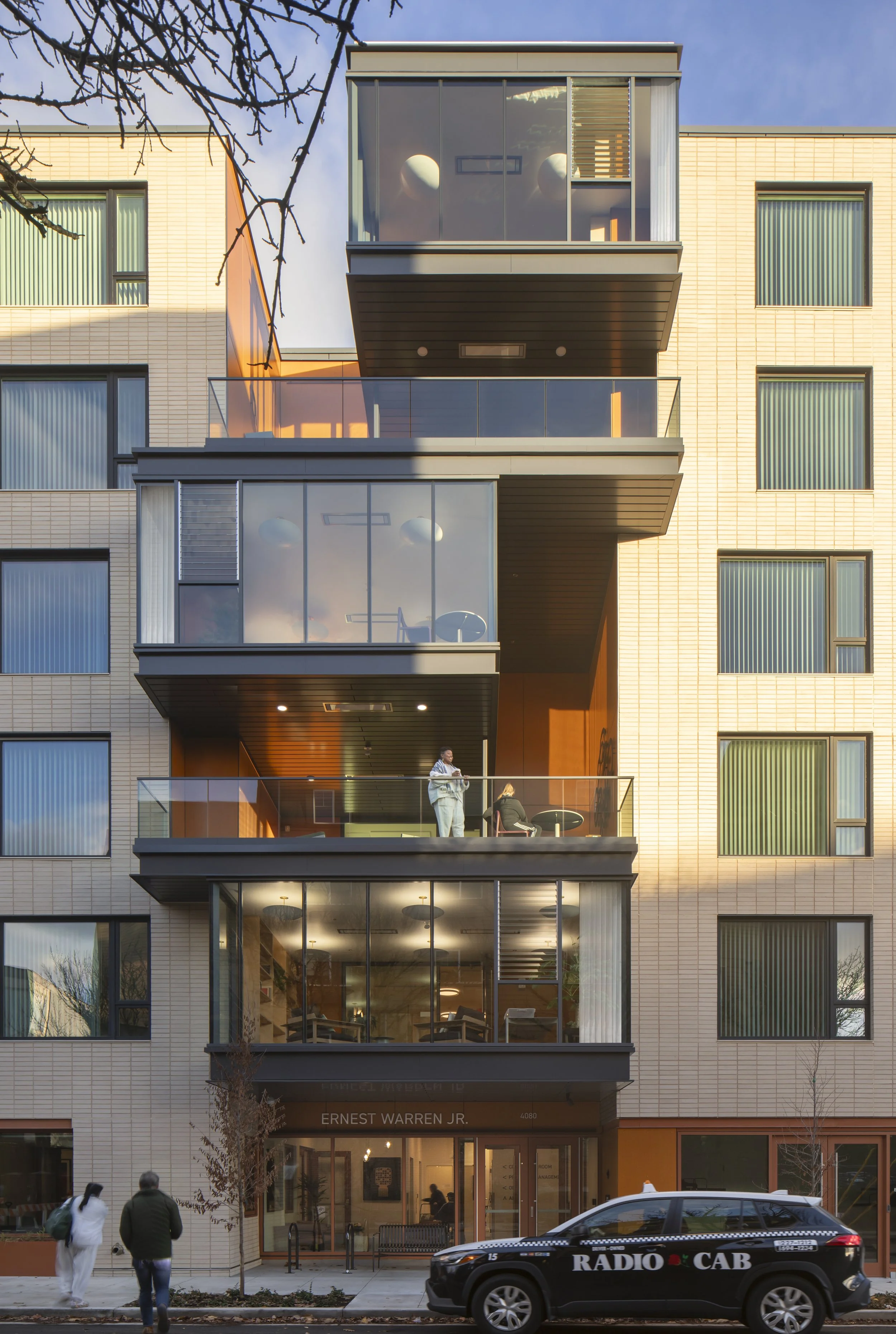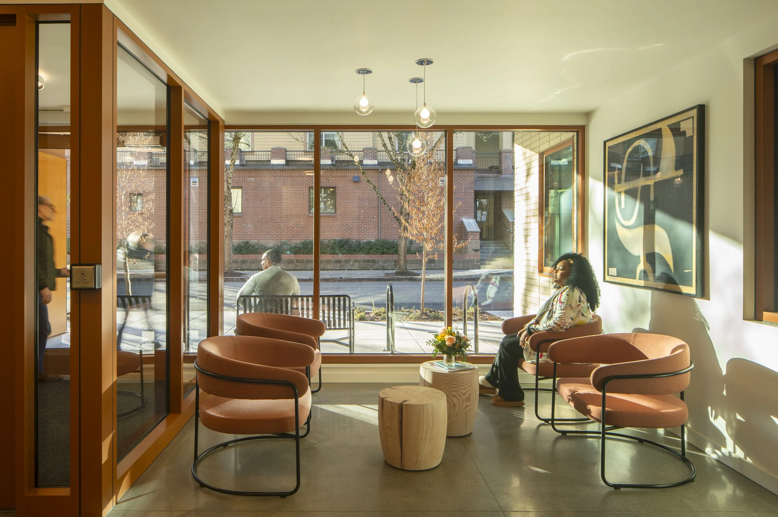 Each floor includes a common area the form of a west-facing “sun room” providing an area for gathering and community within the building.